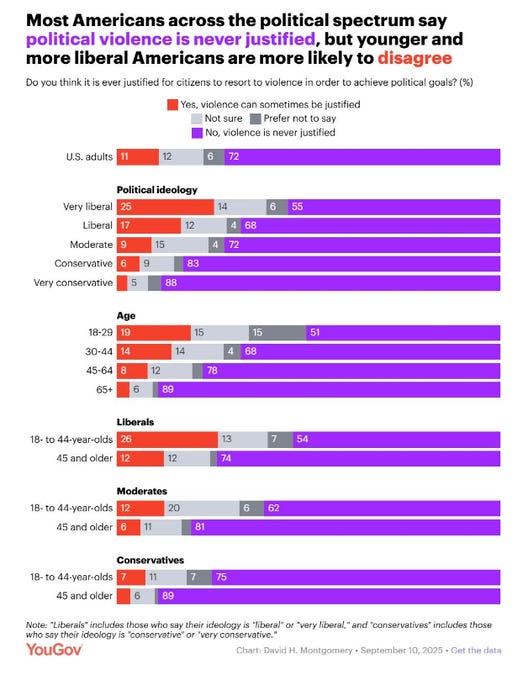 The younger and more liberal the respondents, the more accepting they are of supporting violence. 1/4 of young liberals is not yet a majority of the population, but as we’ve seen with this and the other two assassination attempts, it does not take more than a small number of radicalized (and radicalized by “mainstream” ideas, if that makes sense) to try to kill a president.