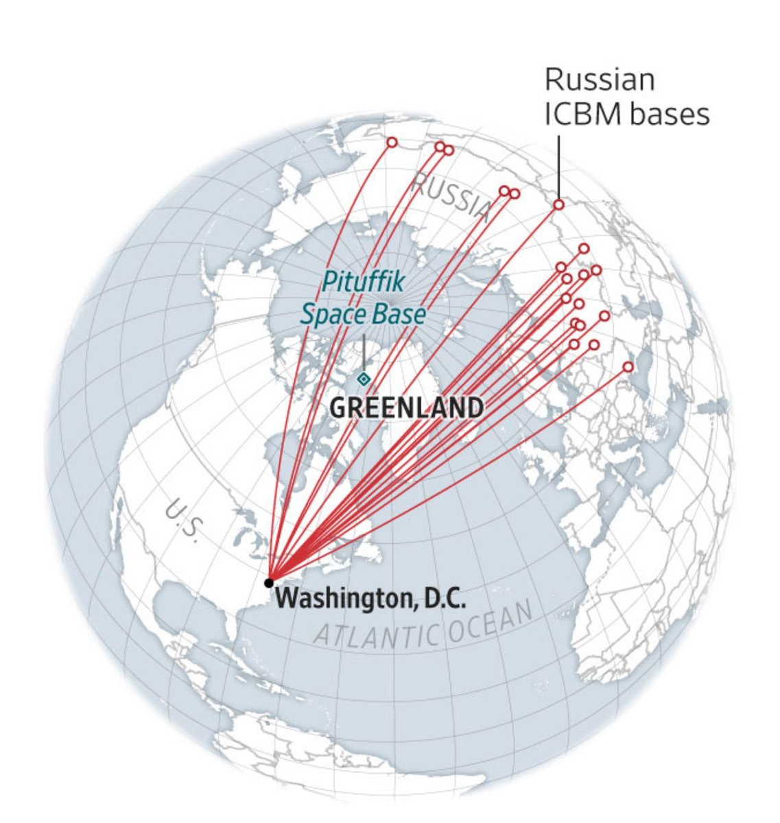 The strategic value of Greenland has been acknowledged by all parties. It is a massive island sitting between Europe, Russia, and the United States. A lot of people have commented on the trade routes that might open up through the Arctic if ice melts, but the more important issue is missile defense. All Russian missiles aimed at the Eastern half of the US would pass over Greenland. For the West of the country the missiles would pass over Alaska. A missile defense system on Greenland would be perfect. [Map from
