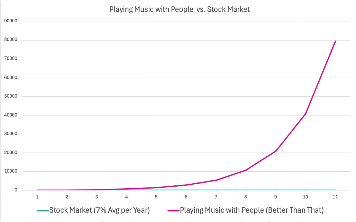 There is a move afoot to return to physical media for music, back to vinyl records and even (gulp) cassette tapes. This is a reasonable move. The same Anti-Intelligence forces that might drive Audiobooks into the ground could also create chaos in the music industry and turn Spotify into a single track, most likely ”Several Species of Small Furry Animals Gathered Together in a Cave and Grooving with a Pict,” on repeat. A change like that might be exciting at first but would get old around minute two. Vinyl records and cassette tapes have an appeal and a place in your music library, but our situation requires an investment strategy that is more medieval—Playing actual instruments with people in physical proximity to you. If playing the music yourself is out of reach, consider investing in a minstrel to travel by your side with a lute. Or consider directing your children to learn a variety of instruments and play them with little to no notice in public settings. At the very least, invite people over and encourage them to bring their instruments and be ready to play. This investment strategy has outperformed anything on the New York Stock exchange since its founding in 1792. The technical investment chart below presents this argument better than I can: